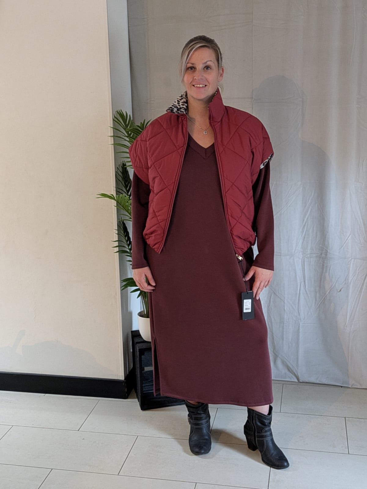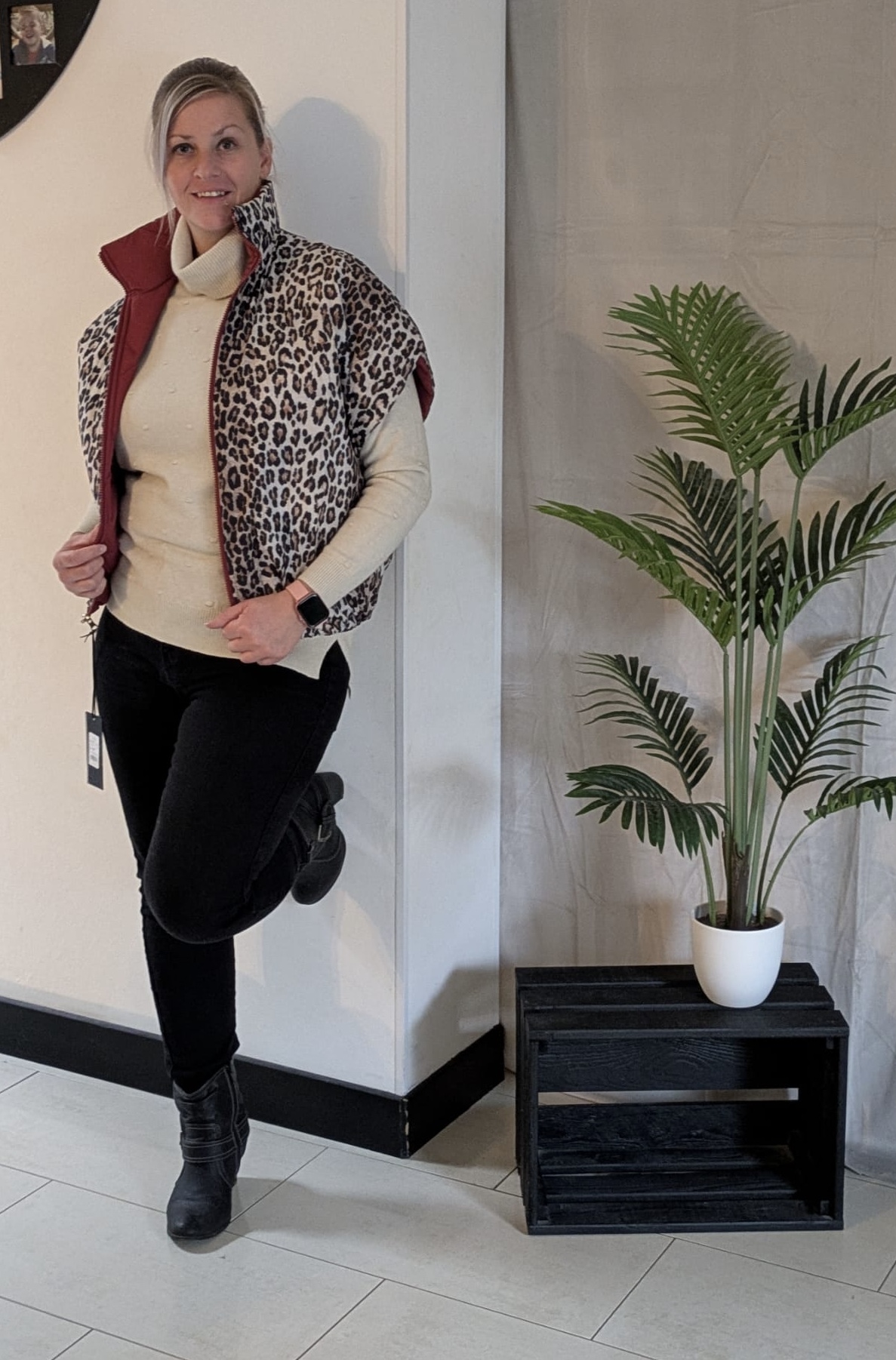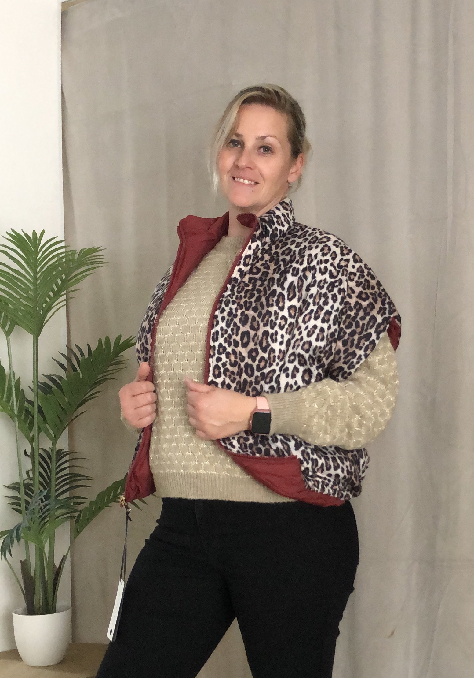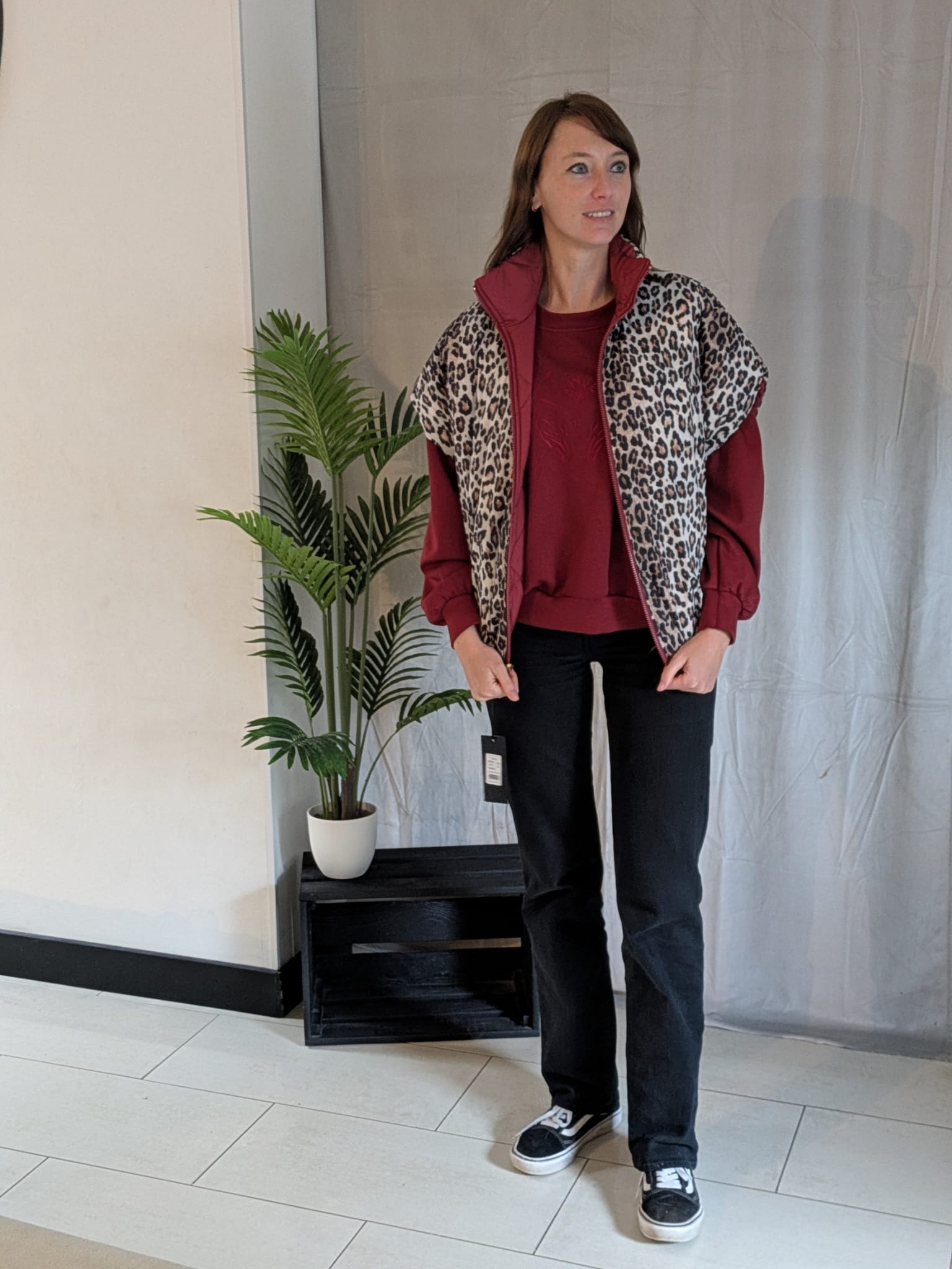 Deze omkeerbare bodywarmer is een echte eyecatcher voor dit seizoen. Aan de ene kant uitgevoerd in een stijlvolle bordeaux kleur voor een klassieke, elegante look, aan de andere kant voorzien van een speelse luipaardprint voor wie houdt van een stoere en trendy uitstraling.