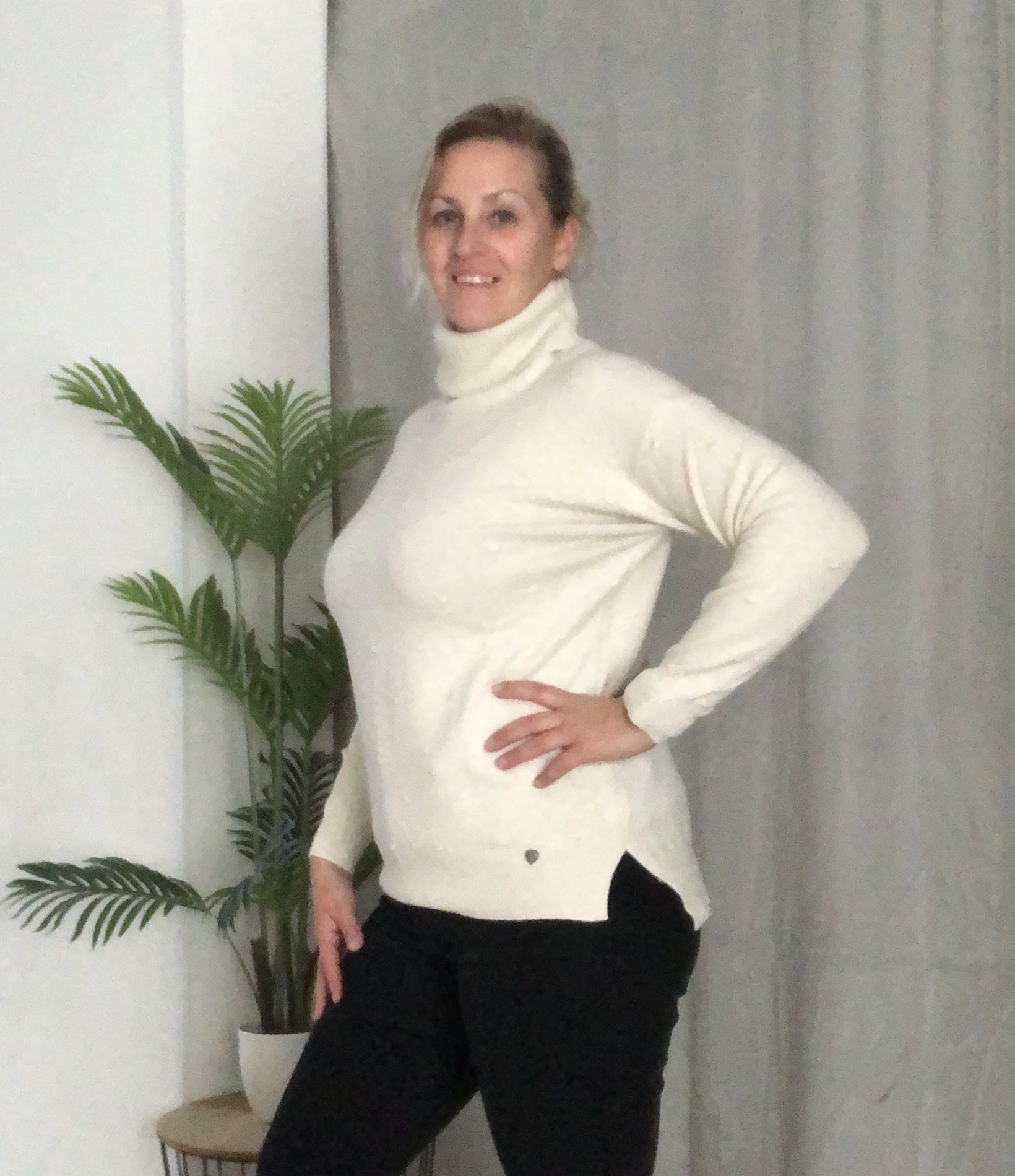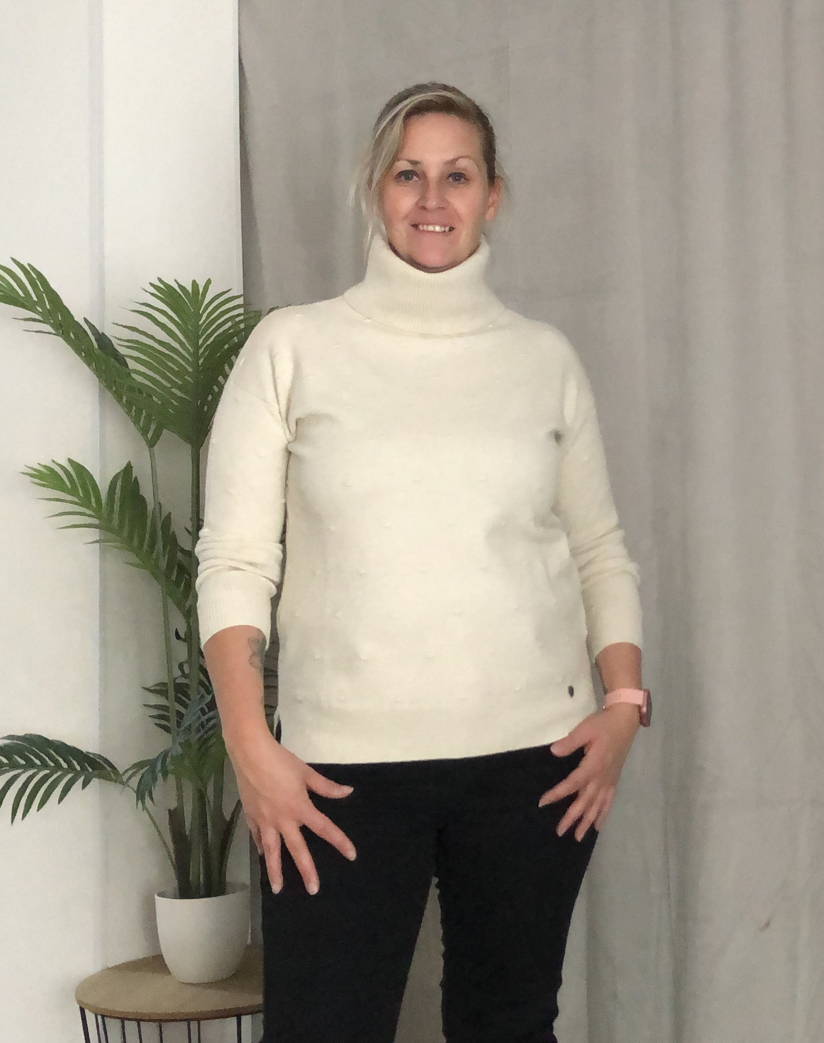 Deze warme beige trui is een echte must-have voor het koude seizoen. De comfortabele col houdt je heerlijk warm, terwijl het subtiele accentje de trui een stijlvolle twist geeft.